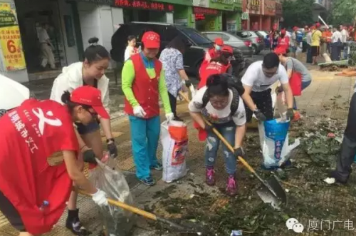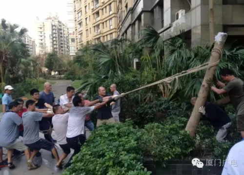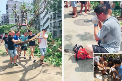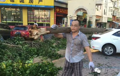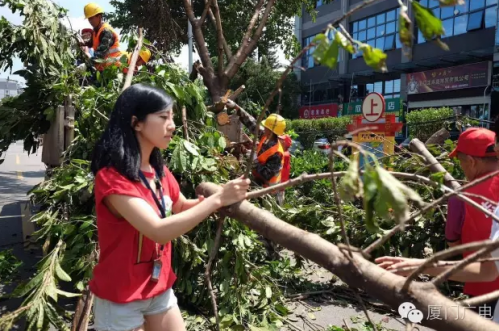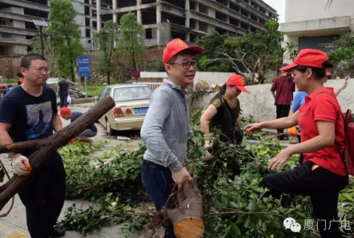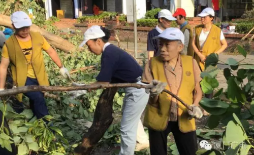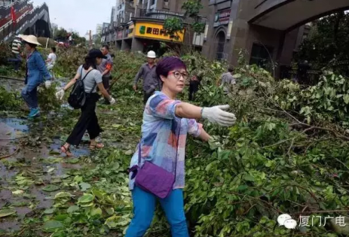 64岁的厦门阿婆叶彩云参加社区自愿服务队,搬开树枝,收拾路途。昨天下午,国贸阳光小区也安排而且展开洁净家乡自救活动。小区居民齐着手,不管是青丝白叟仍是青年壮汉,咱们都一同扶正倒伏树木,收拾废物……