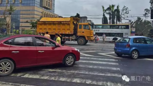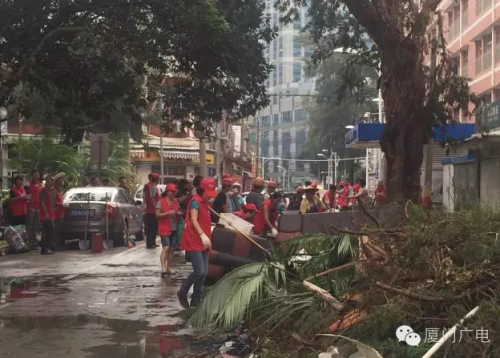 在思明区鹭江大街小学社区的西应殿街上,来自市文联,市交通局, 市政法委等等机关事业单位的工作人员,同社区居民们一道,一同参加到了社区收拾废物排出路障的部队中。打扫路面断木、收拾枝叶…